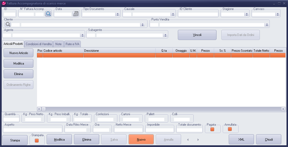 In questa scheda è possibile creare le fatture accompagnatorie di scarico merci dal magazzino. Essa si presenta divisa in due sezioni attivabili attraverso le schede Articoli e Castelletto Iva e Rate che permettono di gestire gli articoli da inserire, le rate per il pagamento e visualizzano il riepilogo IVA.