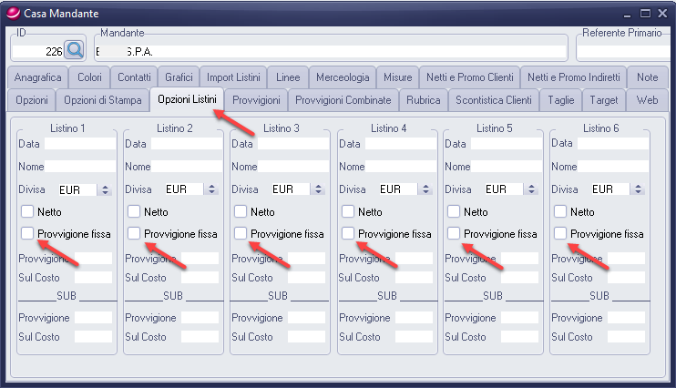 1.Per prima cosa accertarsi che nelle Opzioni Listini della Casa Mandante non sia presente il segno di spunta sulla casella Provvigione Fissa (Fig. 1). Se fosse presente il segno di spunta, fare clic su Modifica (Scheda Anagrafica -> Modifica) e rimuoverla. Salvare i cambiamenti;