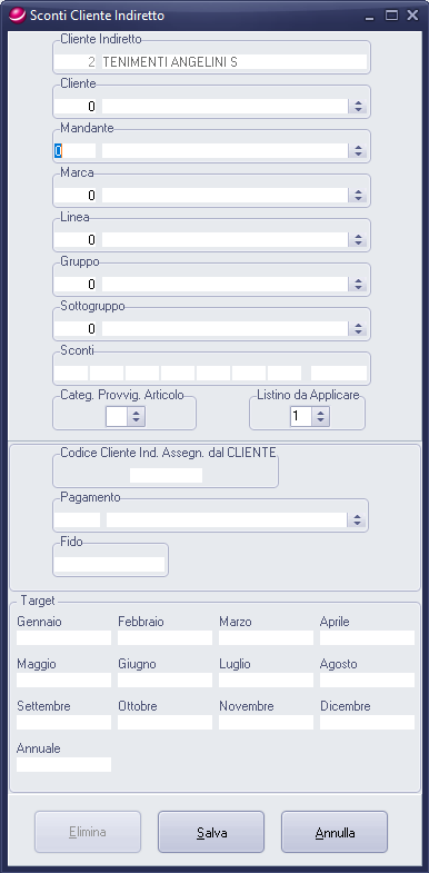 La scheda Scontistica Cliente Indiretto permette di abbinare gli sconti su un dato articolo praticati dall'Agente al singolo cliente indiretto. Si possono settare sia le informazioni descrittive come la marca o la linea a cui č associato lo sconto sia quelle relative al rapporto Cliente-Fornitore, i pagamenti e la consegna della merce. Č altresė possibile, qualora siano presenti, assegnare dei Target di vendita.