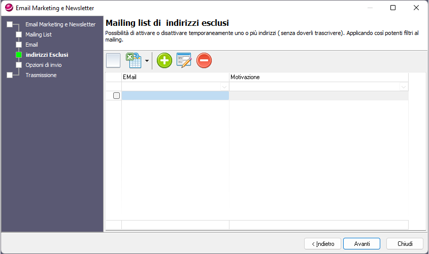 5.Nella quarta finestra (Mailing List di Indirizzi Esclusi) è possibile attivare o disattivare temporaneamente uno o più indirizzi (senza doverli trascrivere). Si applicano così dei potenti filtri al Mailing. Sono presenti 5 pulsanti: