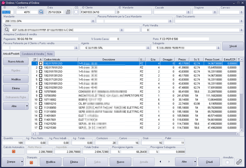 Soffermarsi a sottolineare l'importanza del documento "Ordine" nel processo produttivo di un'organizzazione di vendita, come l'attività di rappresentanza o intermediazione, è assolutamente superfluo. Nella nostra lunga esperienza abbiamo supportato organizzazioni di attività di vendita in cui l'ordine è un documento secondario, al contrario delle elencate e dettagliate funzionalità orientate alla massimizzazione del risultato, all'acquisizione dell'ordine nel minor tempo possibile e con efficacia e precisione verso tutte le parti coinvolte (Cliente, Mandante, Agenzia). Il fine è il superamento delle obiezioni attraverso una consulenza mirata sulla base dei dati storici e statistici, il tutto fruibile ed applicabile contestualmente all'inserimento dell'ordine stesso.