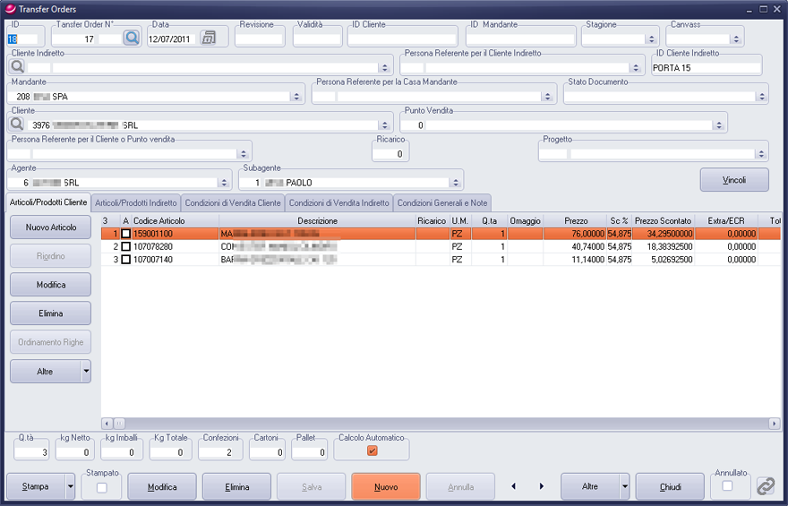 1.Selezionare il Transfer Order desiderato. Per la ricerca utilizzare i metodi trattati nella scheda relativa alla scheda Ordini /Conferme d'Ordine;