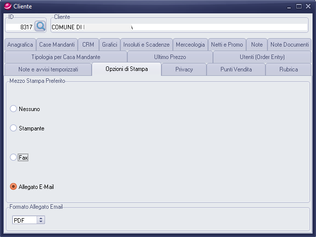 Mediante questa scheda è possibile impostare una modalità predefinita per invio della documentazione in uscita dei documenti relativi al Cliente attivo. Queste impostazioni saranno usate automaticamente dopo la generazione dei documenti, in particolare, con l'opzione Allegato Email in combinazione con uno dei formati disponibili EMF, JPG, PDF, RTF, TXT. Il ns. consiglio è di utilizzare il formato PDF.