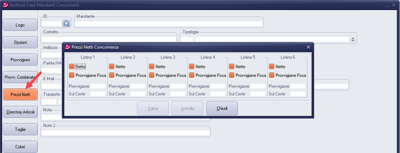 1.Dalla scheda Archivio Case Mandanti Concorrenti (Archivi -> Concorrenza) fare clic sul pulsante Prezzi Netti