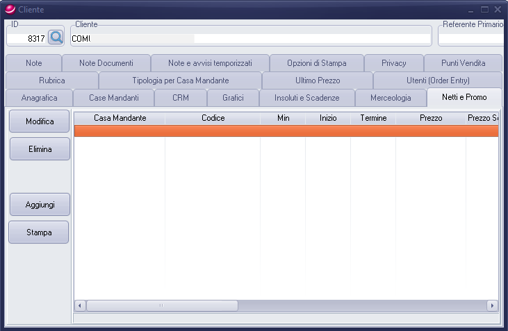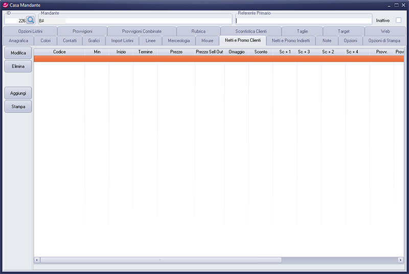 In questa sezione vengono definite le provvigioni personalizzate su Netti e Promo sia per Casa Mandante che per Clienti.