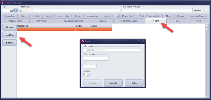 1.Nella scheda Archivi -> Case Mandanti selezionare la Casa Mandante della quale modificare le Taglie e fare clic sulla scheda Taglie;