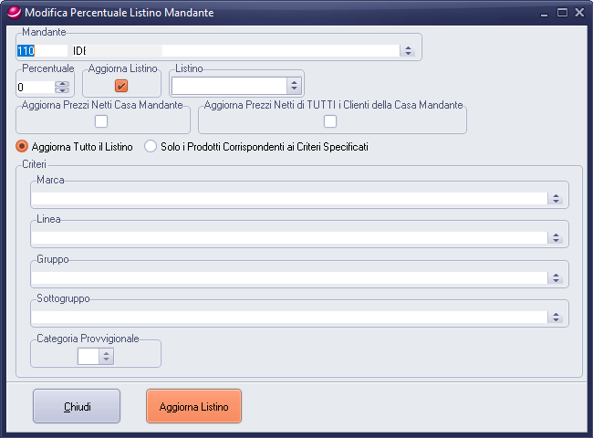 Modifica Percentuale Listino Mandante