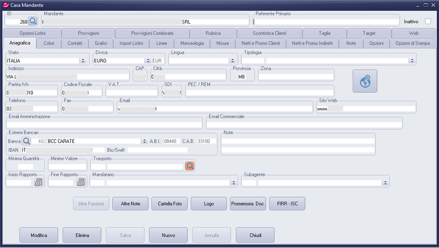 Attraverso la scheda Archivio Mandanti, una delle maschere più complesse del menù Archivi è possibile gestire: