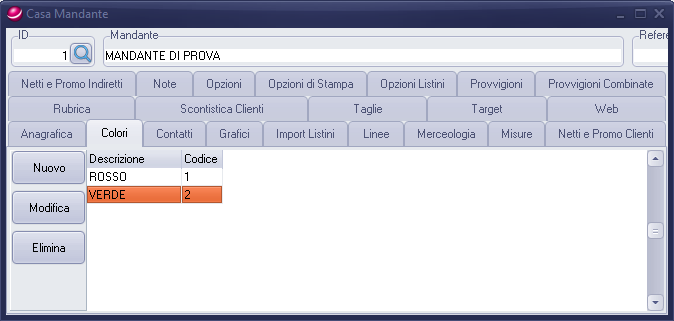 Mediante questa scheda è possibile creare un elenco di colori per gli articoli di una determinata casa mandante. I dati inseriti si useranno poi per creare le combinazioni di taglie e colori nella scheda Articoli.