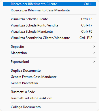 Facendo clic con il tasto destro del mouse sulla finestra Ordine/Conferma d'Ordine si attiva un menù contestuale che permette di accedere ad alcune funzioni. In particolare il menù cambia se viene attivato sull'area degli articoli oppure in una qualsiasi altra parte della finestra.