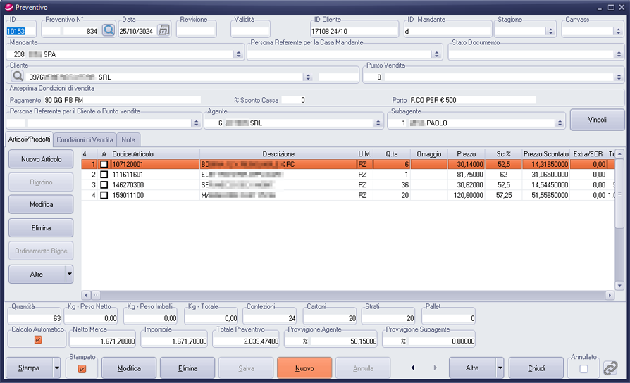 La scheda per la gestione dei Preventivi è identica a quella Ordine / Conferma D'ordine fatta eccezione per il campo validità nel quale indicare la data di fine offerta.