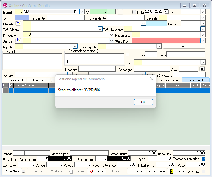 Una volta attivata la casella Controllo Scaduto Cliente, presente all'interno della scheda Opzioni della Ditta, nel momento in cui il nominativo del Cliente viene selezionato per la creazione di un nuovo Ordine, l'Utente verrā avvisato a schermo con un messaggio circa la presenza di uno scaduto e dell'ammontare complessivo di esso.