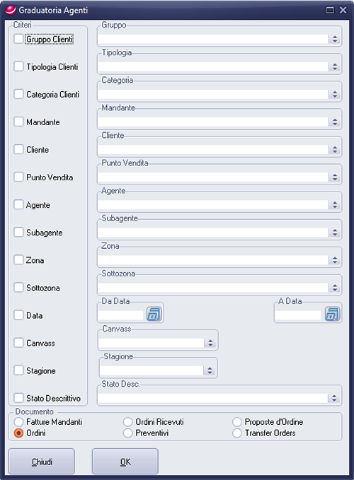 E' possibile effettuare l'elaborazione e la stampa della graduatoria per tipo di documento, ovvero, per Fatture Mandanti, Ordini, Ordini Ricevuti, Preventivi, Proposte d'Ordine, Transfer Orders, selezionando l'opzione dall'area Documento posta in basso alla finestra (fig.).